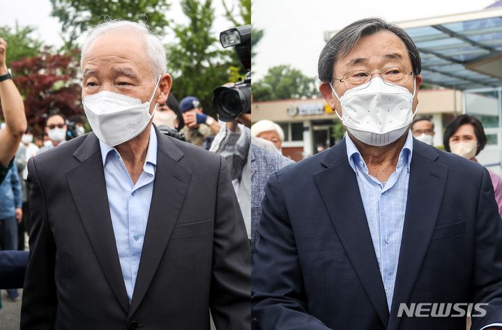 [의왕=뉴시스] 정병혁 기자 = 박근혜 정부 당시 청와대에 특수활동비를 제공한 혐의로 수감됐던 남재준(왼쪽) 전 국가정보원장과 이병기 전 국가정보원장이 30일 경기 의왕시 서울구치소에서 가석방으로 풀려나고 있다. 2022.05.30. jhope@newsis.com