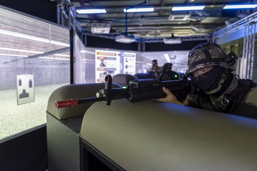 눈앞에 쓰는 VR 기기 대신 착용자의 위치를 인식하는 '공간인식 방탄모'와 적에 의한 피격을 인식하는 '전자감응 전투 조끼'를 착용하고 3면 멀티스크린을 향해 모의 총기로 사격하는 식이다.
