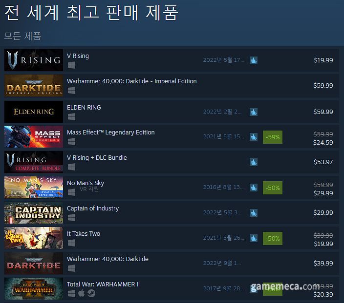 이 밖에 워해머 세계관을 기반으로 한 토탈 워: 워해머 2가 66% 할인으로 10위에 입성했다. 여기에 59% 할인에 힘입은 매스 이펙트 레전드리 에디션이 4위를, 50% 할인하는 잇 테이크 투가 8위를 차지했다.
