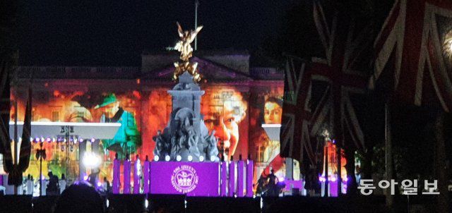 2일(현지시간) 오후 8시 영국 런던 버킹검궁 앞. 이날 저녁에는 버킹엄궁 앞에서 토종 나무 350개로 구성된 21m의 대형 조형물 ‘트리 오브 트리스(Tree of Trees)’가 점등돼 수천명의 인파가 몰렸다. 이날부터 5일까지 나흘간 엘리자베스 2세 여왕(96)의 즉위 70주년을 기념하는 ‘플래티넘 주빌리’ 행사가 열린다. 점등식도 그 중 하나다.