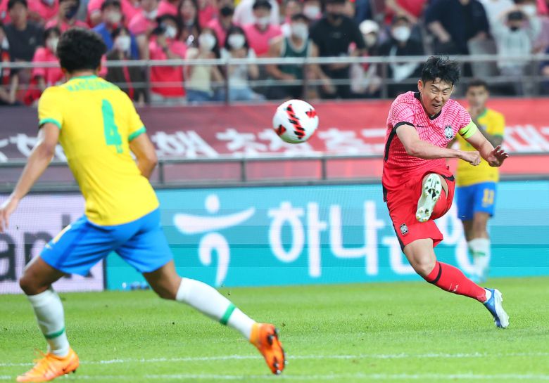 손흥민(오른쪽)이 2일 브라질과의 평가전에서 전매특허인 왼발 감아차기슛을 쏘고 있다. [연합뉴스] |