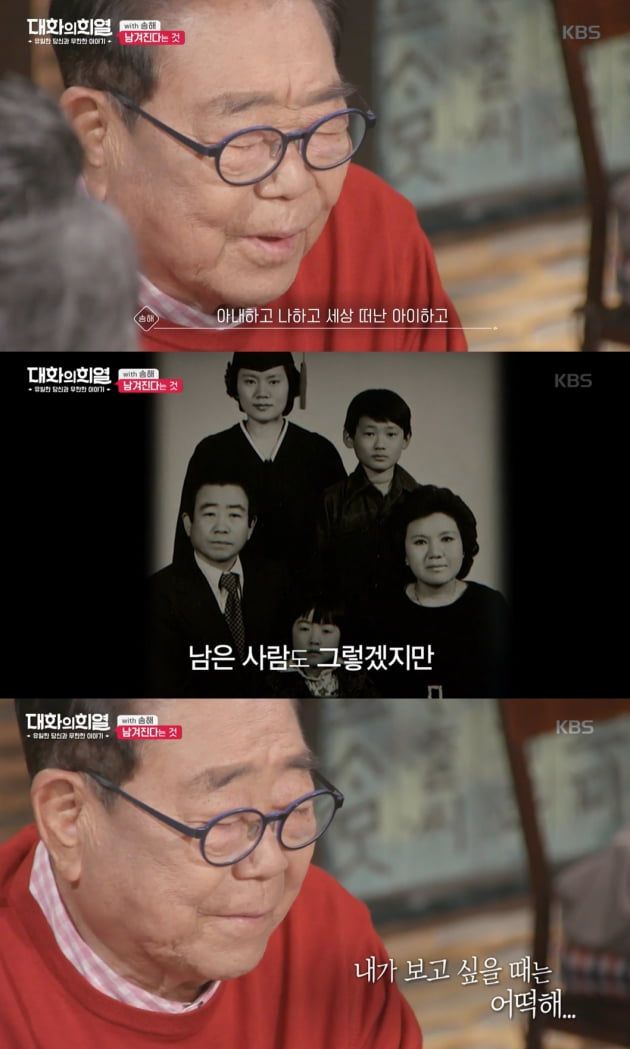 "빈자리는 뭐로도 못 채우죠. 아내하고 나하고 세상 떠난 아이하고 찍은 사진이 있다. 남은 사람도 그렇겠지만 간 사람은 또 얼마나 보고 싶을까 싶어. 함께 찍은 사진을 묘에 넣어주려다가 '내가 보고 싶을 때는 어떡해, 안돼' 차마 넣지 못하고 도로 가져왔다." ('대화의 희열' 中)