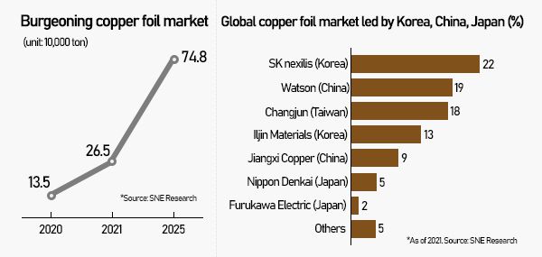 Due to high technological barrier, the market used to be dominated by Japanese firms such as The Furukawa Electric and Nippon Denkai. But Korean firms, focusing on high-quality copper foil production, have overtaken the market. Last year, four firms, including Korea’s SK nexilis and Iljin Materials, China’s Watson, and Taiwan’s Changjun, accounted for 72 percent of the market.