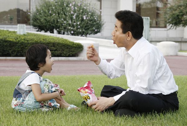 2007년 9월 13일 노 전 대통령이 손녀에게 과자를 주며 장난을 치고 있다. (뉴시스) |