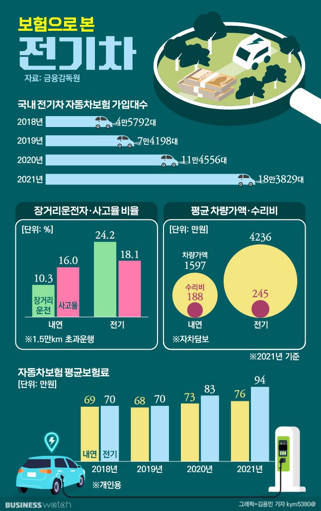 금융감독원이 최근 내놓은 '전기차 자동차보험 현황 및 감독 방향'을 보면 작년말 기준 자동차보험에 가입한 전기차는 총 18만3829대였어요. 2018년말 4만5792대였던 것과 비교하면 301.4%나 늘어난 것이죠.