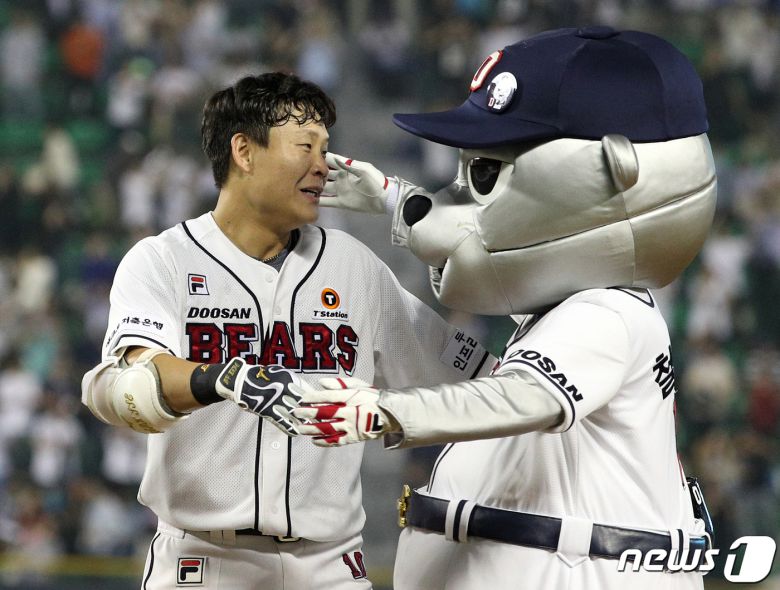 1일 오후 서울 송파구 잠실야구장에서 열린 프로야구 '2019 신한은행 마이카 KBO리그' NC 다이노스와 두산 베어스의 경기 9회말 1사 2루상황에서 끝내기 안타를 친 두산 박세혁이 마스코트의 축하를 받고 있다. 2019.10.1/뉴스1 © News1 황기선 기자 |
