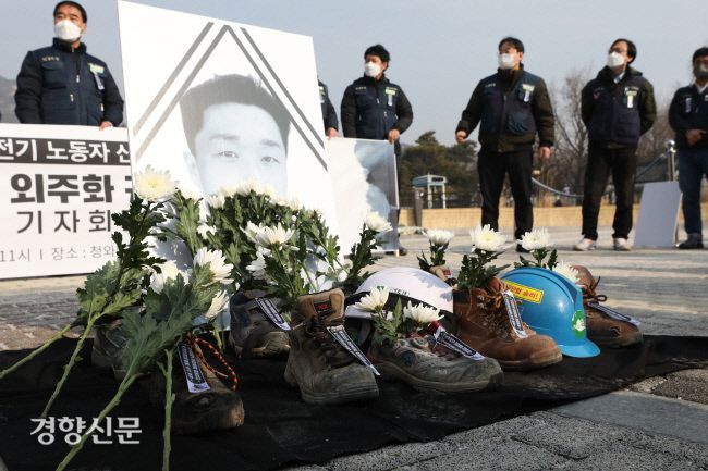 지난 1월10일 민주노총 건설노조가 서울 종로구 청와대 분수대 앞에서 ‘고 김다운 전기노동자 산재사망 추모 및 한전 실태 규탄 기자회견’을 하고 있다. 한수빈 기자 |