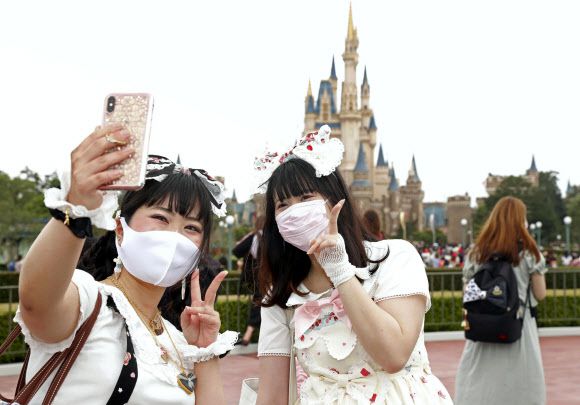 일본 도쿄 인근의 디즈니랜드를 찾은 일본인들이 마스크를 쓴 채 사진을 찍고 있다. AP 연합뉴스