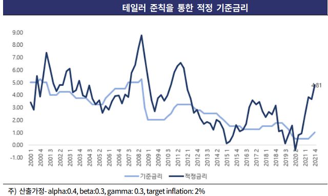 한국의 적정 기준금리가 지난해 말 기준으로 4.8%였으며, 앞으로 금리인상을 과감해게 해야 한다는 주장이 나왔다.