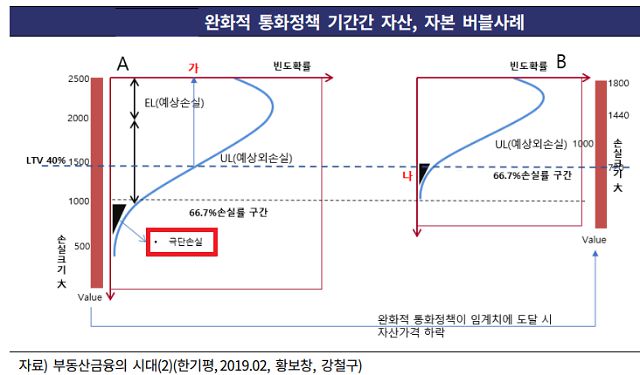 게다가 저금리는 확률은 낮지만 손실률을 기하급수적으로 높일 수 있는 위험을 고조시킨다. 이른바 '테일 리스크(tail-risk)'다. 이 구간에 진입한다면 금융기관들이 충당금을 쌓는 방식으로 리스크에 대응하기 어려워진다. 확률은 0.1%인데 손실률은 67.5%가 되기에 기존의 접근 방식은 한계에 봉착하게 된다. 그간의 완화적 통화정책은 대차대조표를 왜곡했고 저금리는 자산 버블을 무한 재생산해놨다는 지적이다.