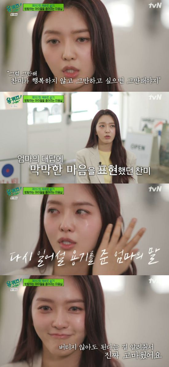 찬미는 "근데 그게 되게 많이 힘이 됐다. '내가 그만두고 싶으면 언제든지 그만둘 수 있으니까 조금만 더 해봐야지'라는 생각을 하게 됐다. 그런 게 엄마한테 고마운 것 같다. 다들 버티라고만 하지 않냐. 버티지 않아도 된다는 걸 알려줘서 정말 고마웠다"라며 눈물 흘렸다.