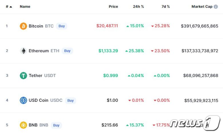 비트코인은 20일 오전 6시 현재 글로벌 코인시황 중계사이트인 코인마켓캡에서 24시간 전보다 15.01% 폭등한 2만487달러를 기록하고 있다.