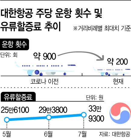 항공권을 다음 달 예매하면 더 비싼 가격을 치러야 한다. 항공권 가격은 출국일이 아닌 예매일 기준인데, 7월 유류할증료가 역대 최고치를 경신했기 때문이다. 7월 대한항공의 국제선 유류할증료는 22단계가 적용돼 거리당 최대 33만9300원이다. 아시아나항공도 최대 26만7300원의 유류할증료를 부과한다. 유류할증료는 고정비용이 큰 항공사들이 연료비를 충당하기 위해 유가변동에 따라 기본운임에 추가로 부과하는 금액이다. 최종 결제자인 소비자의 비용부담이 커지는 것이다.