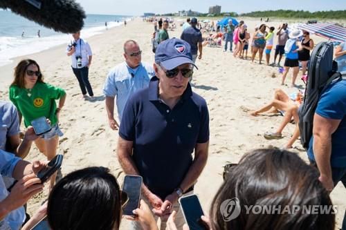 취재진과 문답하는 바이든 대통령[레호보스 비치<델라웨어주> AFP=연합뉴스]