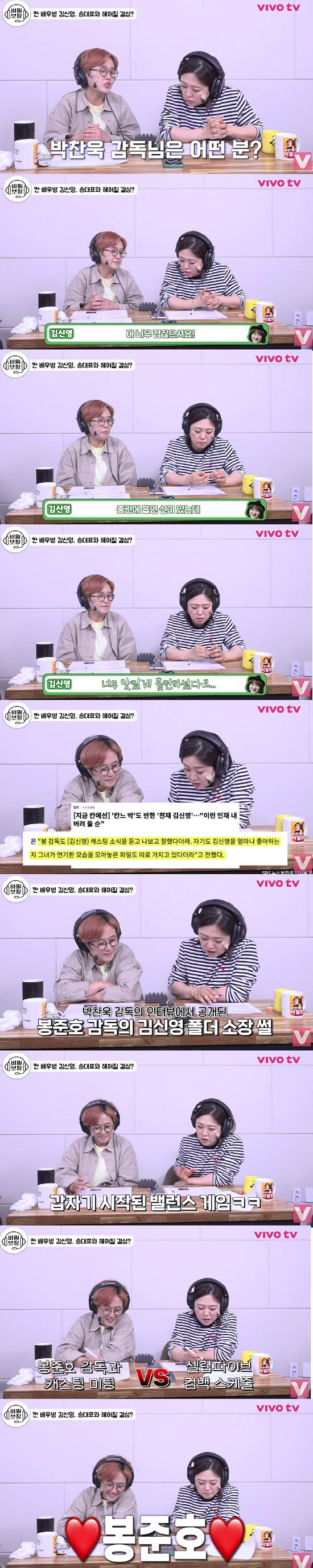 이어 김숙은 봉준호 감독의 인터뷰를 언급하며, "봉준호 감독도 김신영이 연기한 모습을 모아놓은 파일을 따로 가지고 있다"라고 말했다. 이에 김신영을 향한 봉준호 감독의 팬심이 돋보였다.