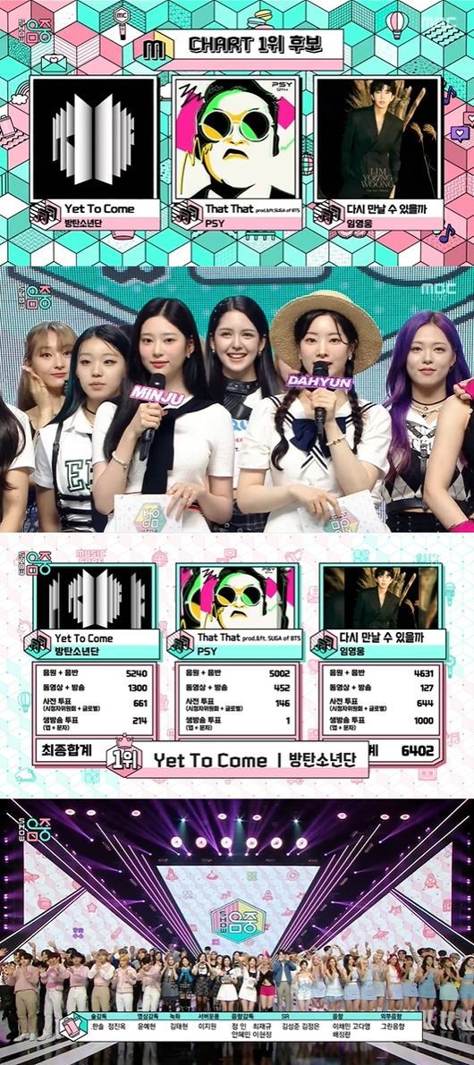 25일 오후 방송된 MBC '쇼! 음악중심'에서는 방탄소년단의 'Yet To Come', 싸이의 'That That', 임영웅의 '다시 만날 수 있을까' 등이 1위 후보로 맞붙었다. 스페셜 MC로는 트와이스 다현이 함께 했다.