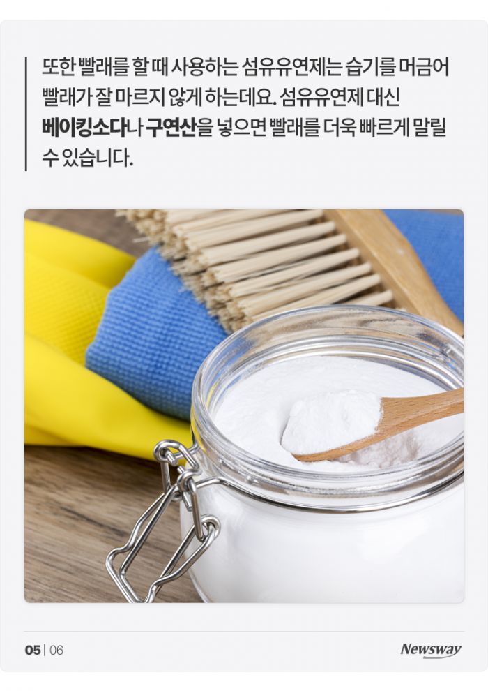 또한 빨래를 할 때 사용하는 섬유유연제는 습기를 머금어 빨래가 잘 마르지 않게 하는데요. 섬유유연제 대신 베이킹소다나 구연산을 넣으면 빨래를 더욱 빠르게 말릴 수 있습니다.