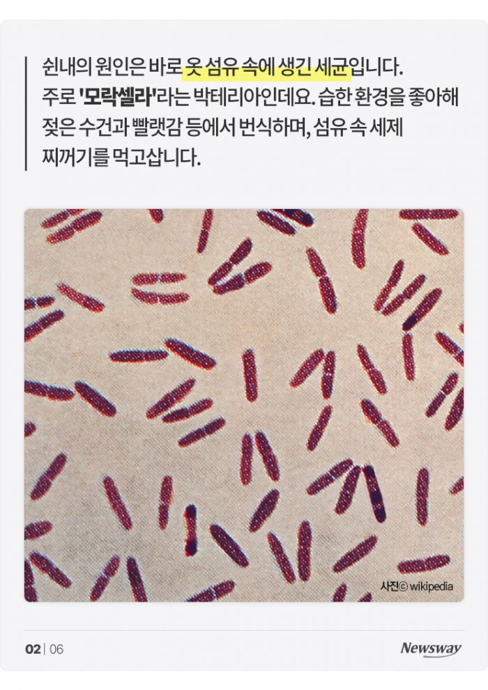 쉰내의 원인은 바로 옷 섬유 속에 생긴 세균입니다. 주로 '모락셀라'라는 박테리아인데요. 습한 환경을 좋아해 젖은 수건과 빨랫감 등에서 번식하며, 섬유 속 세제 찌꺼기를 먹고삽니다.