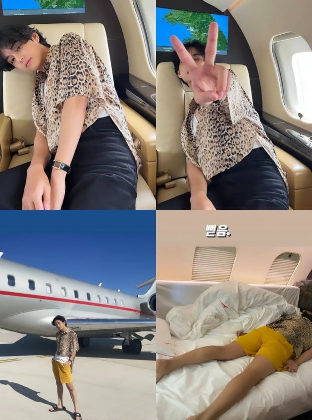 출국당시 강한 바람으로 인해 뷔를 곤란하게 만들었던 셀린느의 호피무늬 셔츠을 입고 아련한 표정으로 카메라를 바라보는 사진과 윙크를 하며 브이를 한 사진은 팬들을 설레게 했다. 또 오랜시간 비행중에 피곤함을 느꼈는지 ‘뻗음’이라고 쓴 사진에서는 침대에 엎드려 귀여운 모습을 연출했다.