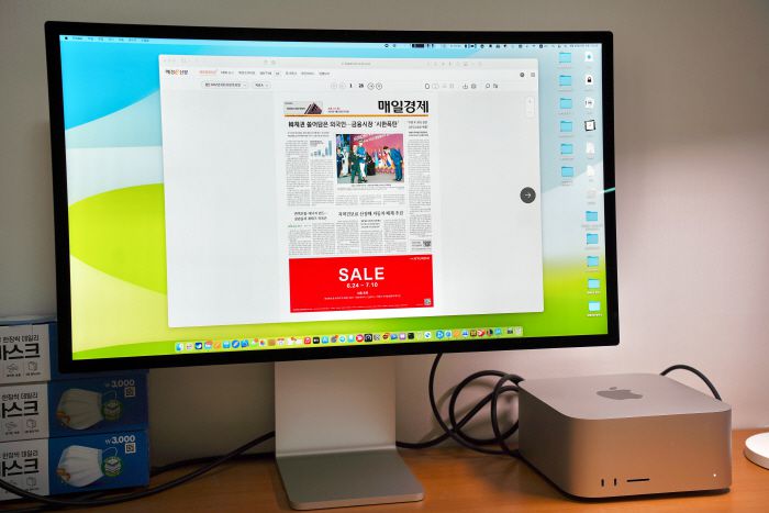맥 스튜디오를 스튜디오 디스플레이에 연결해 매일경제 e신문 홈페이지를 띄운 모습 |