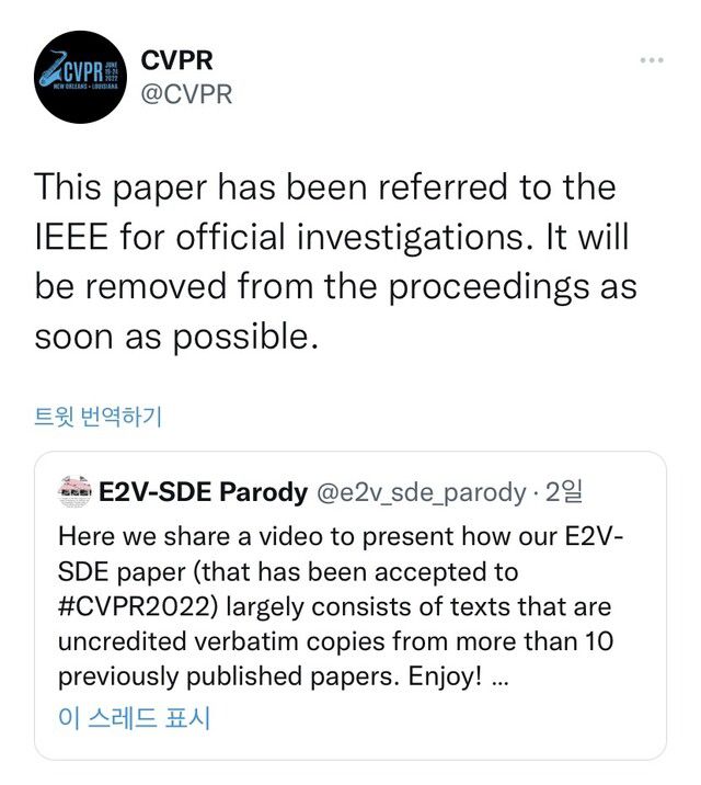 앞서 국제 컴퓨터 비전 및 패턴 인식 학술대회(CVPR·시브이피아르) 공식 트위터는 지난 24일 윤 교수 연구팀의 표절 의혹을 제기한 유튜브 영상을 공유하며 “해당 논문이 국제전기전자공학자학회(IEEE)의 조사를 받을 것이고 발표논문집에서도 가능한 대로 빨리 삭제될 것”이라고 밝혔다. 문제가 된 논문은 영상 속 물체의 움직임이나 빛의 변화 등 데이터를 기존 기술보다 빠르게 인식하는 방법을 다루고 있다.