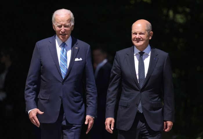 조 바이든 미국 대통령(왼쪽)과 올라프 숄츠 독일 총리가 26일(현지시간) 독일 바이에른주 엘마우성에서 사흘간의 열리는 G7 정상회의 첫날 사진을 찍기 위해 걸어가고 있다. EPA연합뉴스 |