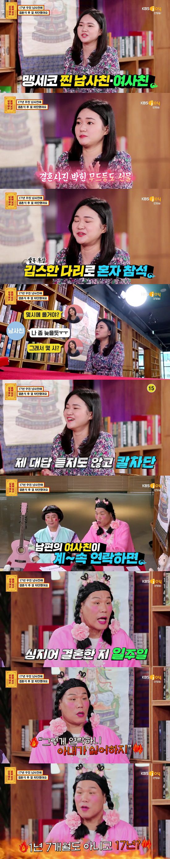 서장훈과 이수근은 "여자 애가?"라며 동시에 질문했고, 고민녀는 "남자인데 친구다"라고 답했다. 그러자 이수근은 "100%다. 와이프가 '여자 다 차단해라'라고 해서 약속한 거다"라고 이야기했다. 고민녀는 "차단 할거면 결혼식 전에 해야 되는 거 아니냐. 먹튀지않냐"라고 말했다. 그러면서 "17년간 친구로 알고 지냈는데"라며 "알고 보니 전 여친이거나 썸을 탄 적도 없다"라고 주장했다.
