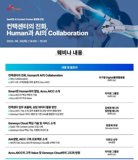 이를 위해 SK㈜ C&C는 오는 30일 '컨택센터의 진화, 휴먼과 인공지능(AI)의 협력' 웨비나를 개최한다.