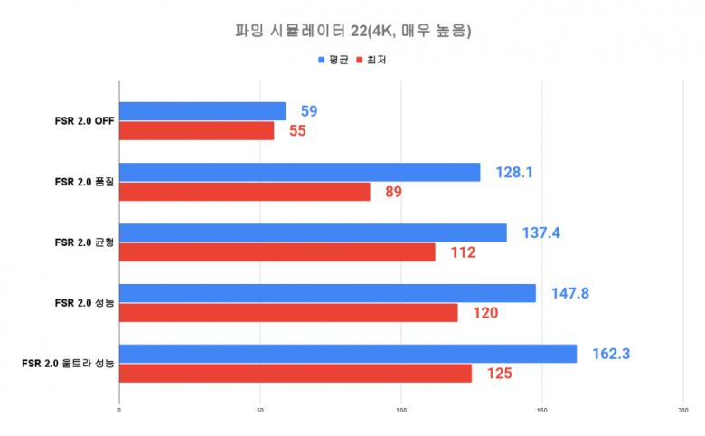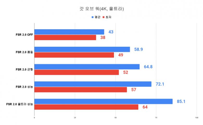 하지만 FSR 2.0을 이용하면 상황이 많이 나아진다. FSR 2.0 성능 모드에서는 약 30프레임 정도의 성능 향상을 경험할 수 있었으며, 품질 모드에서도 60프레임에 근접한 수준으로 게임 플레이가 가능했다. 특히 울트라 성능 모드를 활성화하면 더 부드러운 프레임 아래 게임을 즐길 수 있다.