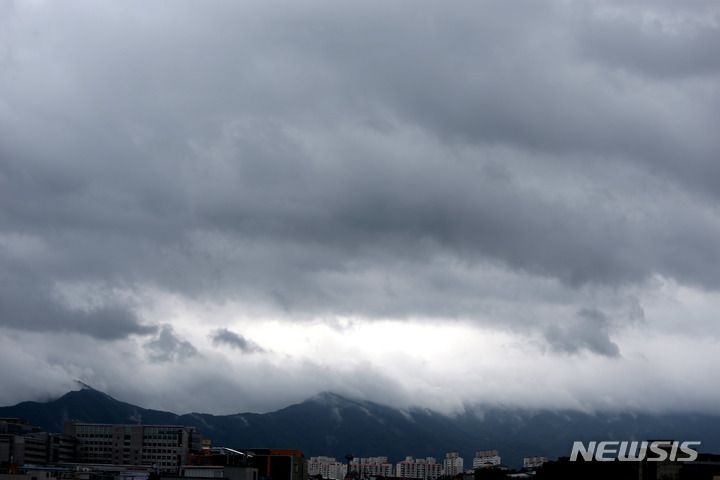 [춘천=뉴시스] 김경목 기자 = 23일 오후 올여름 첫 장맛비가 내리고 있는 강원도 춘천시 하늘이 온통 짙은 먹구름으로 뒤덮였다. 2022.06.23. photo31@newsis.com