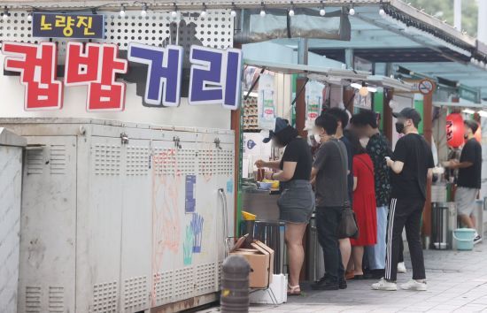 28일 점심시간 서울 노량진 컵밥거리에서 학생들이 컵밥을 먹고 있다. 치솟은 물가 여파로 재료비가 오르면서 서울 노량진 컵밥 가격도 값이 올랐다. [이미지출처=연합뉴스] |