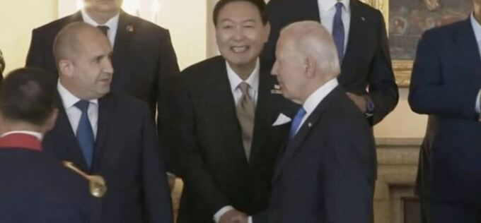 29일(현지시각) 미국 조 바이든 대통령이 윤석열 대통령에게 ‘노룩악수’를 했다고 회자되는 장면. 연합뉴스TV 갈무리 |