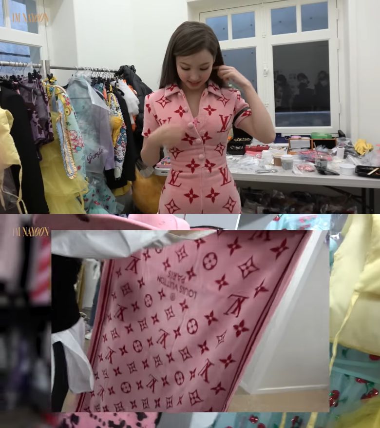 이날 특히 눈길을 끈 것은 타이틀곡 'POP!' 뮤직비디오에서 등장한 명품 L사의 문양이 새겨진 의상이었다. 나연은 "이번 뮤직비디오에서 총 12개의 의상을 준비했다. 일단 지금 입은 옷은 엄청 큰 타올"이라고 소개했다.