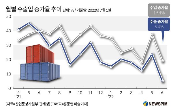 1일 산업통상자원부가 발표한 '2022년 6월 수출입동향'에 따르면 6월 수출은 577억3000만달러(+5.4%), 수입은 602억달러(+19.4%)를 기록했다. 무역수지는 24억7000만달러 적자를 나타냈다.