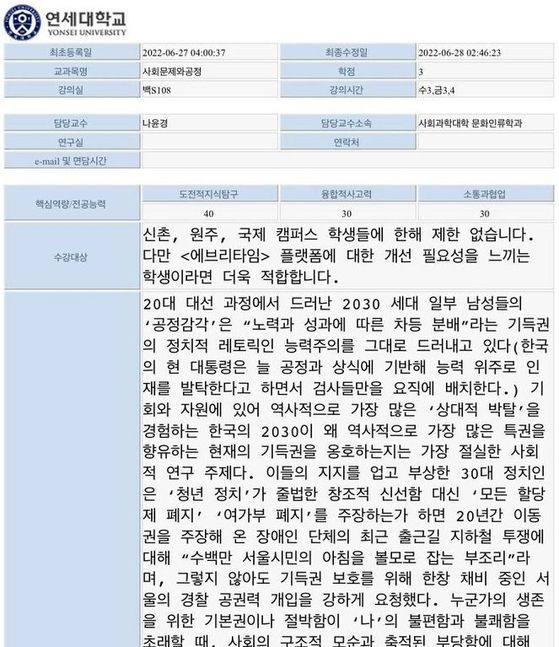 오늘(2일) 각종 사회관계망서비스(SNS)와 커뮤니티 등에는 나윤경 연세대 문화인류학과 교수가 지난달 27일 학사관리 홈페이지에 등록한 2022학년도 2학기 '사회문제와 공정' 수업계획서가 회자되고 있습니다.