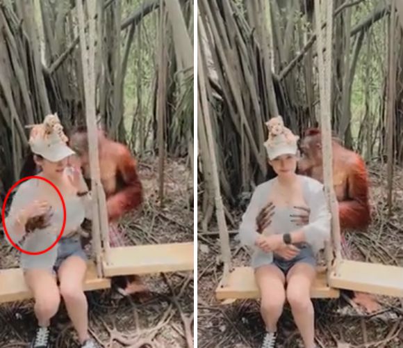 이 여성이 그네에 앉아 카메라를 응시하기 시작했을 때, 오랑우탄 한 마리가 그녀의 뒤에서 모습을 드러냈다. 이 오랑우탄은 여성 등 뒤로 다가가더니 마치 인사를 하는 듯한 몸짓을 취했고, 이내 자신의 앞발로 여성 관광객의 신체를 만지기 시작했다.