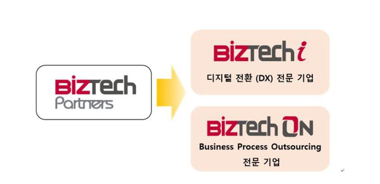 IT서비스 기업 비즈테크파트너스가 사업 전문성 강화를 위해 지난 1일부로 디지털 트랜스포메이션(DX) 솔루션 전문기업인 비즈테크아이(Biztech i)와 비즈니스 프로세스 아웃소싱(BPO) 전문기업 비즈테크온(Biztech On)으로 인적분할을 단행했다고 3일 밝혔다.