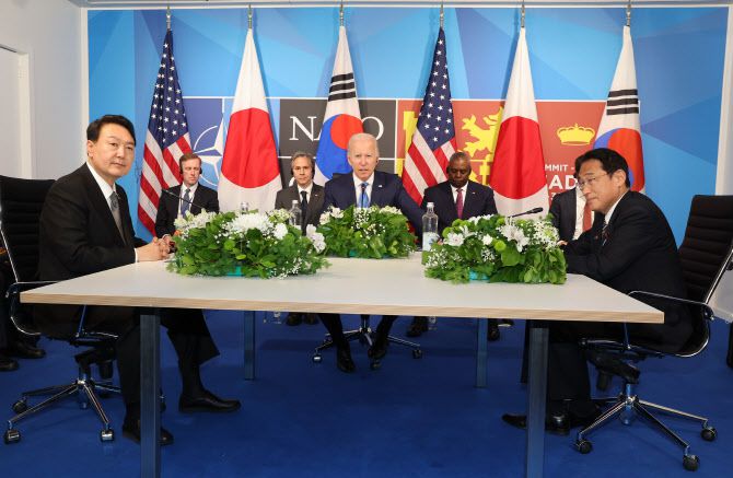윤석열 대통령이 6월 29일 스페인 마드리드 이페마(IFEMA) 컨벤션센터에서 열린 한미일 정상회담에서 조 바이든 미국 대통령, 기시다 후미오 일본 총리와 대화하고 있다. (사진=연합) |