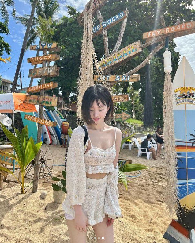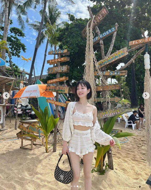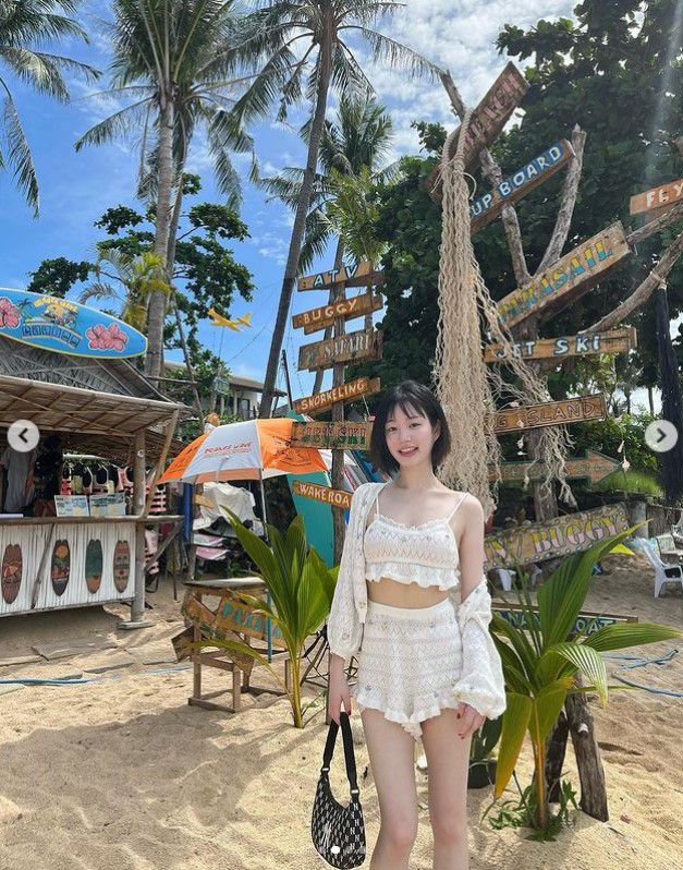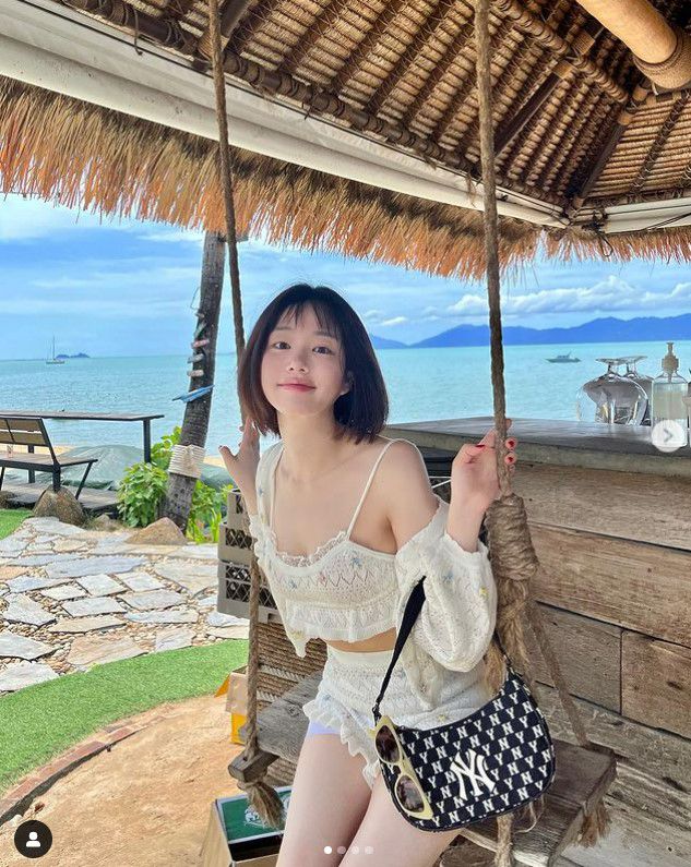 공개된 사진 속 이유비는 태국 해변에서 시간을 보내고 있는 모습. 이유비는 끈으로 된 민소매 크롭티에 핫팬츠를 입고 태국 해변에서 포즈를 취하고 있다. 그녀의 가녀린 어깨와 잘록한 허리, 새하얀 피부가 시선을 끈다.