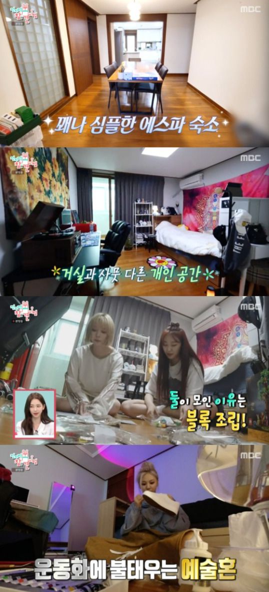 이어 방송 최초로 에스파의 숙소가 공개됐다. 에스파의 숙소는 화려할 것 같았지만 체리 몰딩과 황토색 마룻바닥 등 정겨운 색채를 띠고 있었다.