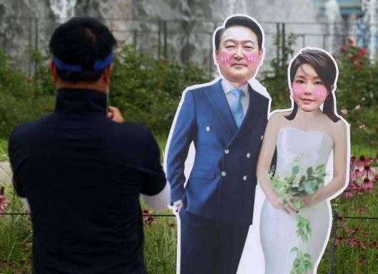 지난 7일 오후 서울 종로구 청와대 분수대 앞에 설치된 윤석열 대통령과 부인 김건희 여사의 등신대를 찾은 한 시민이 촬영을 하고 있다. /사진=뉴시스 |