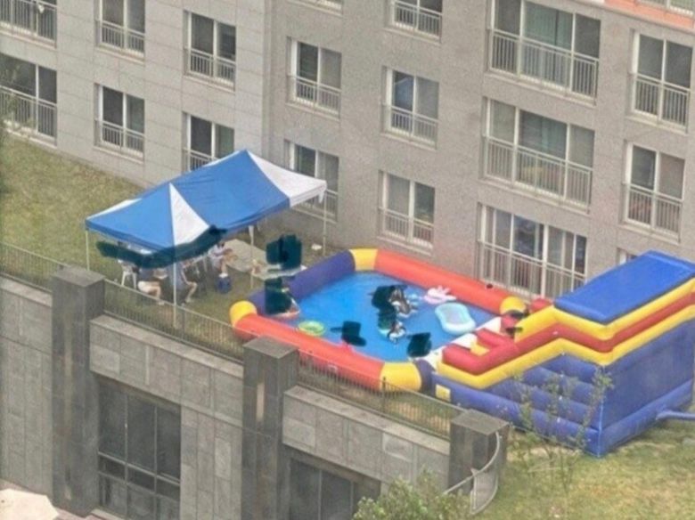 9일 자동차 관련 네이버 카페에는 “아파트 공용 공간에 에어바운스를 설치하고 즐기는 분이 있다”는 글과 함께 사진 4장이 올라왔다. 에어바운스는 공기를 불어 넣어 만드는 이동식 놀이터다. 공개된 사진에는 잔디밭에 설치된 이동식 수영장에서 아이들이 놀고 있는 모습이 담겼다. 옆 천막에는 어른들이 앉아 있다. 이 에어바운스는 미끄럼틀이 달려있으며 1층 창문 만한 높이다. 집에서 호스를 연결해 수영장에 물을 채우는 모습도 포착됐다.