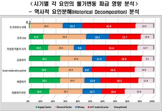 국제 원자재가격이 물가에 미치는 영향도 30% 중반 수준에서 러시아의 우크라이나 침공 후 42.9%로 확대됐다. 반면 영향력이 40%를 웃돌았던 '공급 및 수요' 요인은 지난해 하반기를 기점으로 영향력이 줄고 있다. 이승석 한경연 부연구위원은 "코로나19 발생 전엔 중국이 세계의 공장 역할을 하면서 저물가 기조가 10년 가까이 이어졌다"며 "코로나19를 계기로 세계 공급망이 재편되고, 특히 시중 통화량이 크게 늘어나면서 물가 결정 요인의 파급 경로에 구조적인 변화가 생긴 것으로 보인다"고 설명했다.