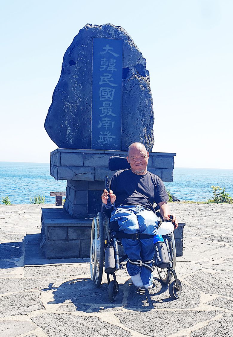 - 휠체어에 탄 이규식씨가 마라도 여행을 마치고 제주도로 향하는 여객선에 타고 있다. 어느 것 하나 쉽지 않은 여행이었다. 마라도 선착장에선 계단을 내려가야 승선할 수 있어 휠체어를 들어 옮겨야 했다.제주 김주연 기자