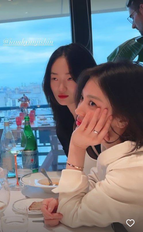 공개된 사진 속 송혜교는 프랑스 파리에 위치한 한 레스토랑에서 식사를 마친 뒤 사진을 찍고 있는 모습이다. 턱을 한 손으로 괴고 이야기를 경청해주는 송혜교의 모습이 인상적이다. 송혜교의 옆에는 모델 신현지가 자리했다. 신현지 역시 송혜교와 같은 곳을 바라보고 있다.