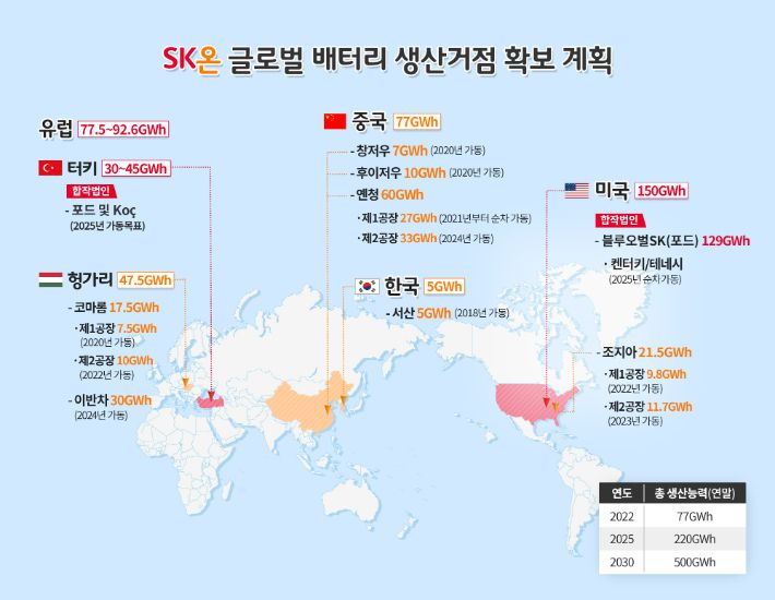 SK온은 미국과 헝가리, 중국 등에서 꾸준한 투자를 통해 2017년 1.6GWh에 불과했던 배터리 생산능력을 올해 말까지 77GWh로 확대하고, 2030년까지는 500GWh 이상으로 늘려나갈 계획이다.