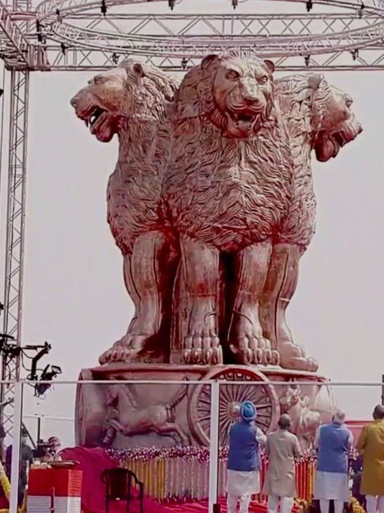 앞서 인도 정부는 국회의사당을 새로 짓고 지난 11일 개관식에서 이 사자상을 공개했다. 새 국회의사당 옥상에 설치된 사자상은 높이 6.5m, 무게 9.5t 규모인 청동조각상이다. 원형 받침대 위에 네 마리의 아시아 사자가 등을 맞대고 있는 모습이다. 인도 정부는 전국 각지에서 100여 명의 장인을 모아 9개월에 걸쳐 사자상을 제작했다.