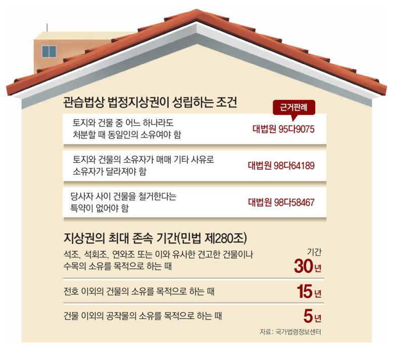법정지상권은 토지 위의 지상물을 소유하기 위해 그 토지를 사용할 수 있도록 법률로 보장하는 권리다(민법 제366조 참조). A 씨 사례는 판례에 의해 법정지상권과 비슷한 권리가 인정되고 있는 관습법상 법정지상권이다. 관습법상 법정지상권은 토지와 건물이 같은 소유자에게 속했다가 그중 어느 하나가 매매 기타 사유로 소유자가 다르게 된 경우에 건물을 철거하기로 한 특약이 없으면 건물 소유자가 취득하는 지상권이다. 소유권의 권능 일부를 제한하는 제한물권(근저당권, 전세권 등)의 존재를 전제하지 않는다는 점에서 법정지상권과 다르다.