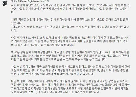 '영국남자' 측은 "해당 학생은 본인의 나이의 거의 두 배인 여성분에 의해 금전적 보상을 기반으로 '온라인 그루밍'을 당했다"라며 "학교는 즉시 학생을 보호하기 위한 조치를 취하였으며, 이제 모든 상황이 해결됐다"고 전했다.