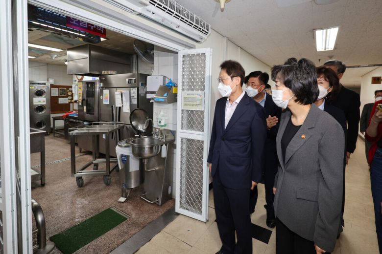 박순애 사회부총리 겸 교육부 장관이 15일 오전 특수학교인 서울경운학교에 방역 점검 및 교육 시설 참관을 위해 방문해 급식실을 둘러보고 있다. 공동취재사진 |